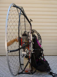 You can see all the photos here. His main changes to the basic design were to bend the radial tubes so the prop would be inside the cage, mounting the MZ34 and SD harness system, adding a second hoop, and some changes to the bottom frame to provide more protection and support for the fuel tank. He's gonna have it at the Salton sea in February. Ed note: Curving the radial arms like this ONLY helps if the safety ring is used as Jeff has done. Also, be aware that too much curve will can be a problem for forward inflations. The lines could ride up the safety ring instead of the outer ring. That friction would cause wear on both the netting and paraglider lines. Plus, it would make such inflations more difficult. Modifications should be done with great care and understanding of all the consequences! |
